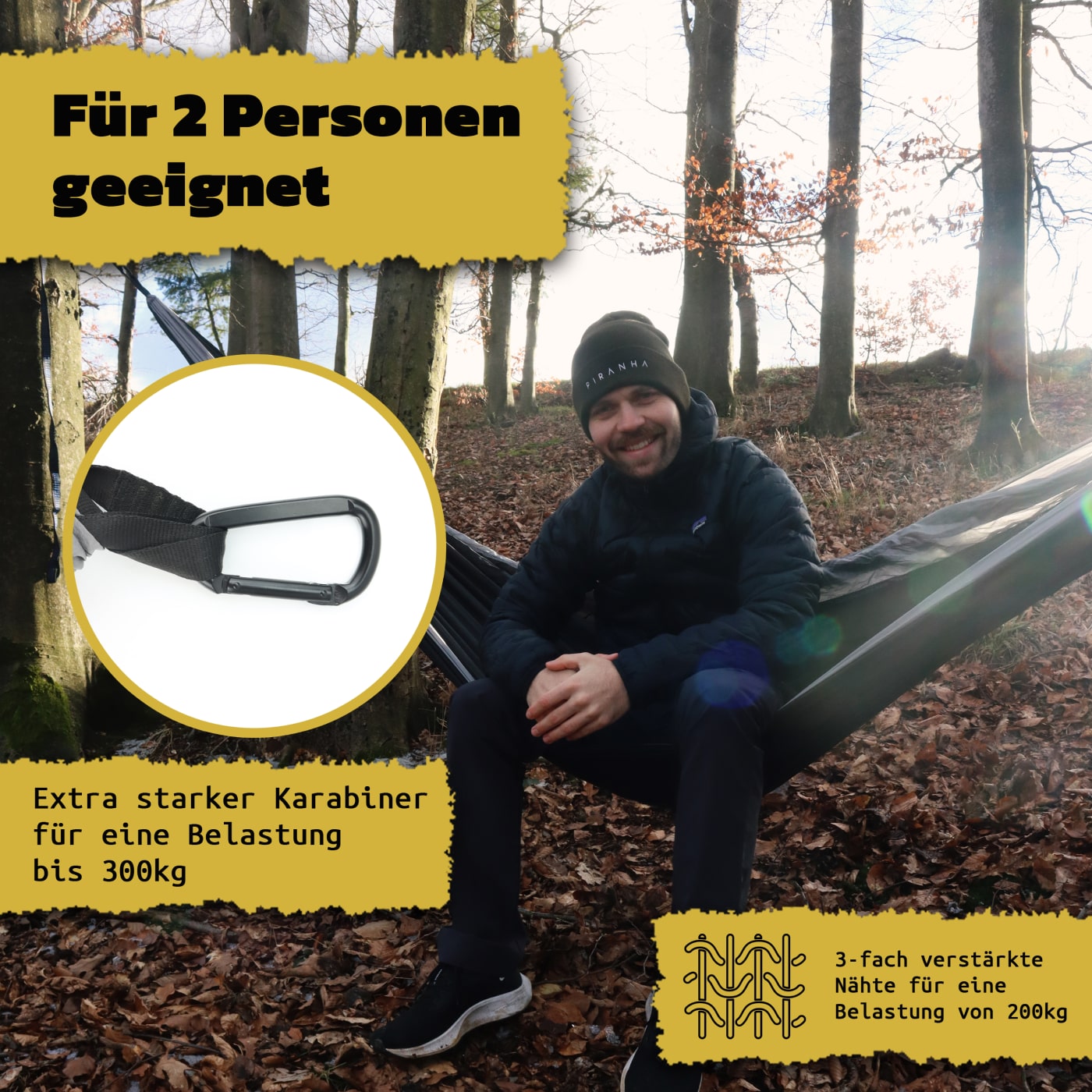 ✔️[EXTREM ROBUST] Trotz ihres geringen Eigengewichts von 790 g, hält die Hängematte einer Belastung von bis zu 200 kg stand, die Karabiner sogar bis 300 kg und lässt somit keinerlei Zweifel an ihrer Stabilität aufkommen. Selbst eine Doppelbelegung sind somit kein Problem!